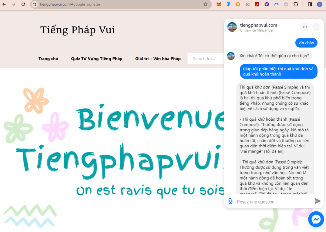 Trong thời đại công nghệ số, việc học ngôn ngữ mới đã trở nên dễ dàng và tiện lợi hơn bao giờ hết. Đặc biệt, với sự ra đời của tiengphapvui.com, người học tiếng Pháp tại Việt Nam giờ đây có thêm một công cụ đắc lực: chatbot hỗ trợ học tiếng Pháp. Website này không chỉ là một nguồn tài nguyên phong phú cho những ai muốn nâng cao kỹ năng ngôn ngữ của mình mà còn là một nền tảng tương tác, giúp việc học trở nên thú vị và hiệu quả hơn.