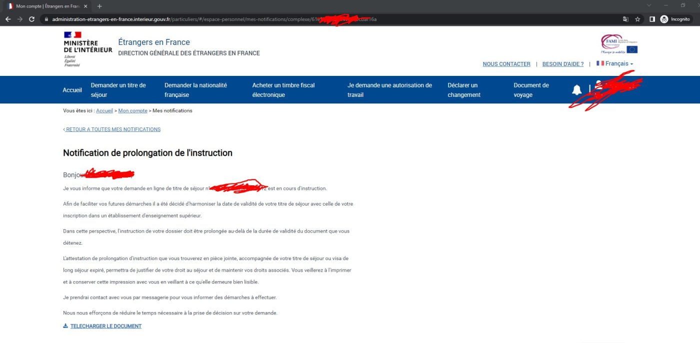 (Step 1: Login and go to the page to download your “Notification de décision” or your “Notification de prolongation de l’instruction”)