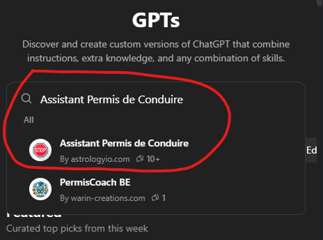 Hoặc các bạn có thể tìm trong GPT Store với tên “Assistant Permis de Conduire” như sau
